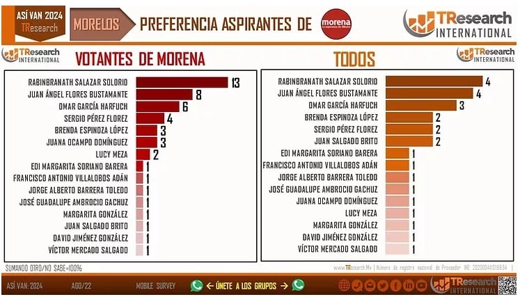 Según la encuestadora nacional TResearch International de Carlos Penna Charolet, a dos años de la elección, Rabinbranath Salazar Solorio se posiciona como el #aspirante favorito de los votantes de #MORENA rumbo a la #gubernatura de #Morelos con una preferencia del 49%. Mientras que Morena tiene una preferencia entre el electorado del 35% contra su más cercano rival que sería Acción Nacional con un 12% de las preferencias. Estos números se han mantenido más o menos estables durante los últimos meses según el reporte mensual de la casa encuestadora.